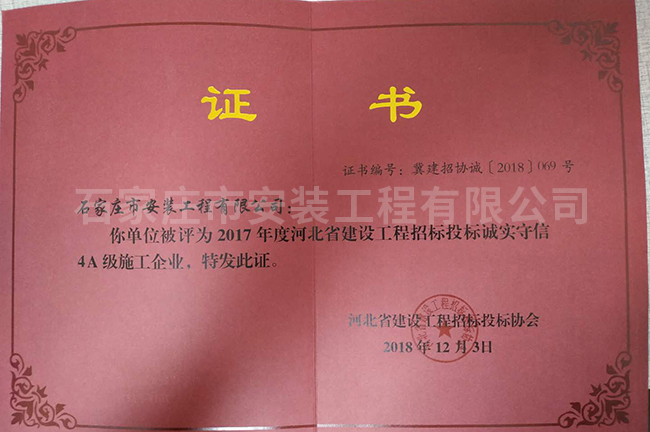 2017年度河北省建設(shè)工程招標(biāo)投標(biāo)誠實(shí)守信4A級施工企業(yè)